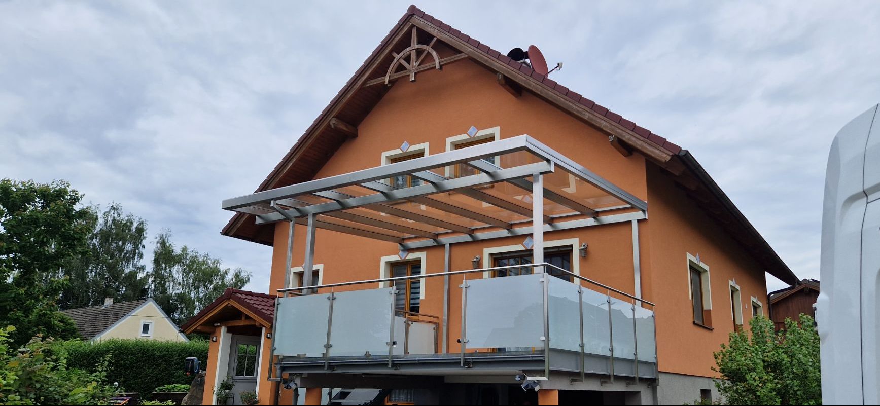 Bei diesem Neubau durften wir eine Eingangsüberdachung mit einer seitlichen Verglasung, die ca. bis zur Hälfte der Überdachung…