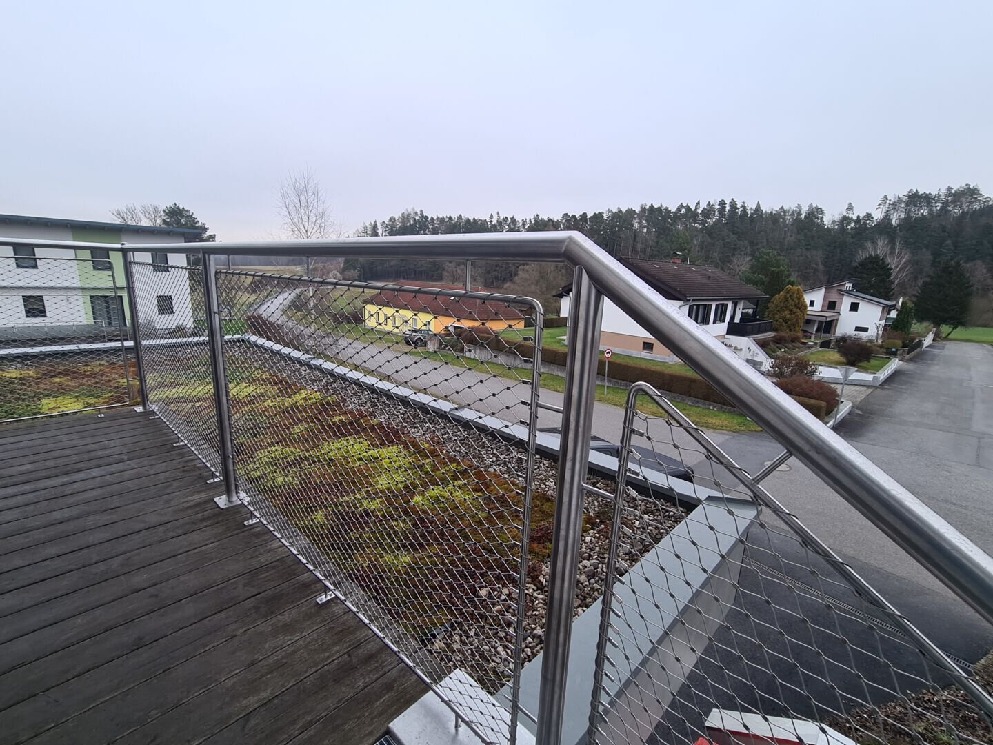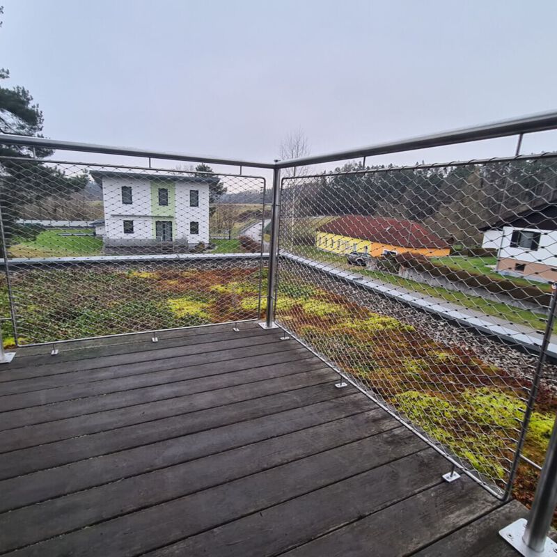 Bei diesem Edelstahlgeländer dient ein Seilnetz als Füllung. Das bietet den Vorteil der guten Sicht, entspricht aber trotzdem…