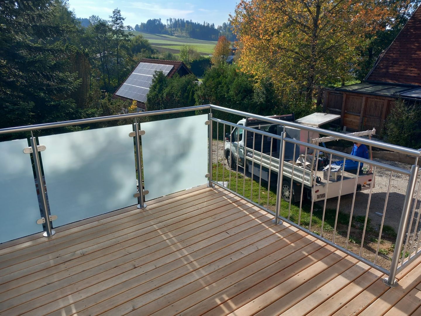 Bei diesem Balkongeländer wurde ein Standard-Edelstahlgeländer mit einem Milchglas-Edelstahlgeländer kombiniert. Durch einen zusätzlichen Sichtschutz aus Milchglas, bietet der Balkon jetzt genügend Privatsphäre. Das Milchglas wurde von uns zugekauft und montiert.